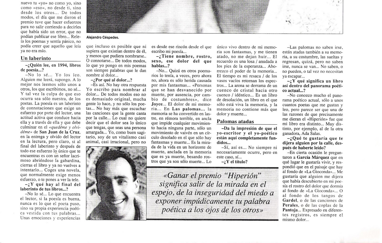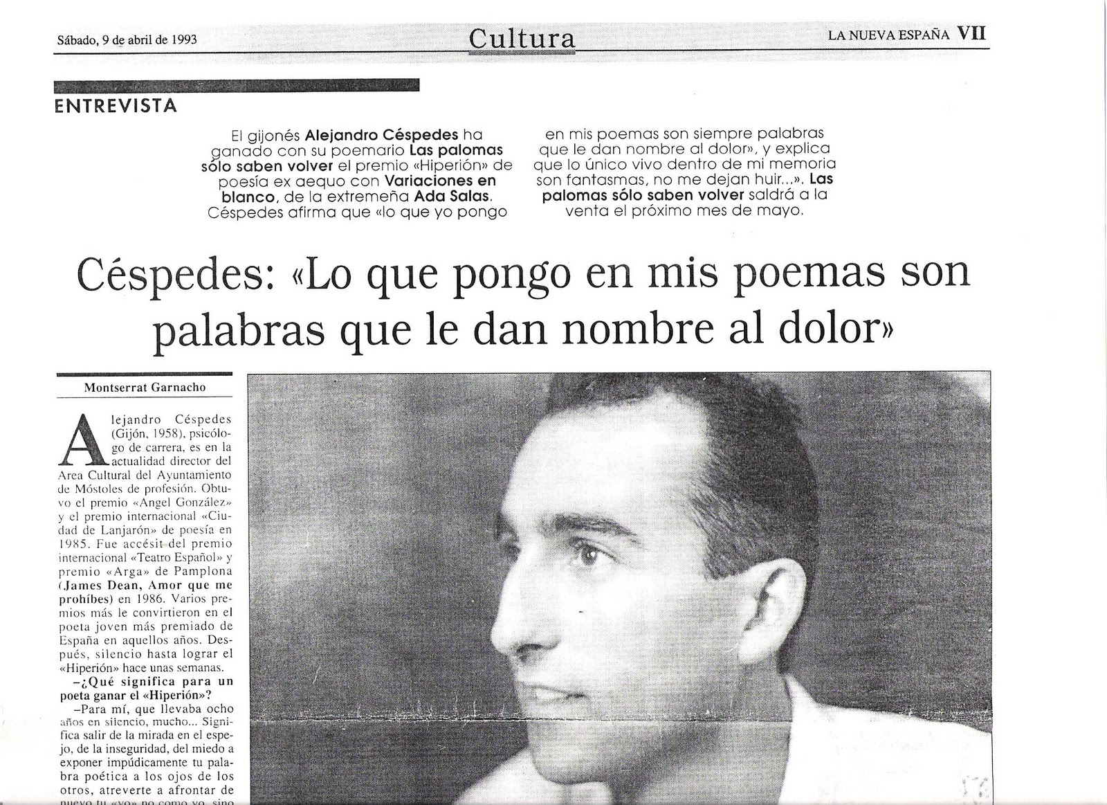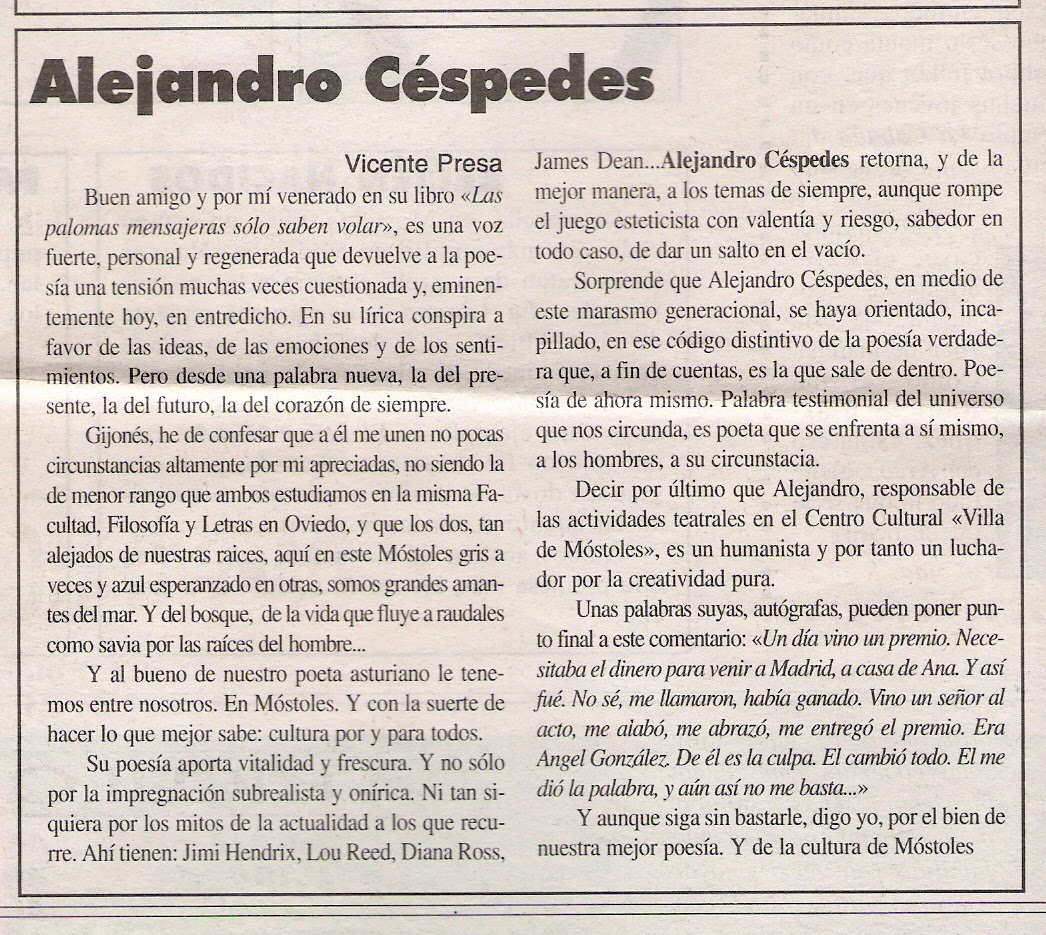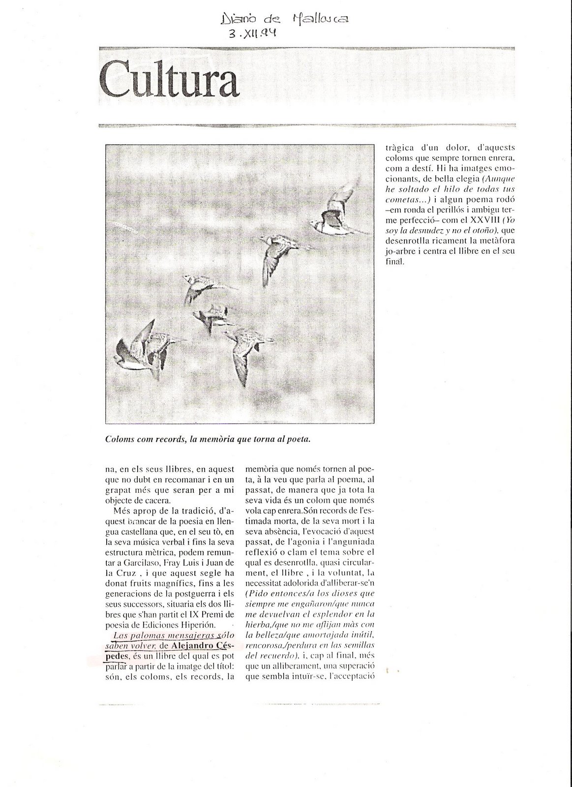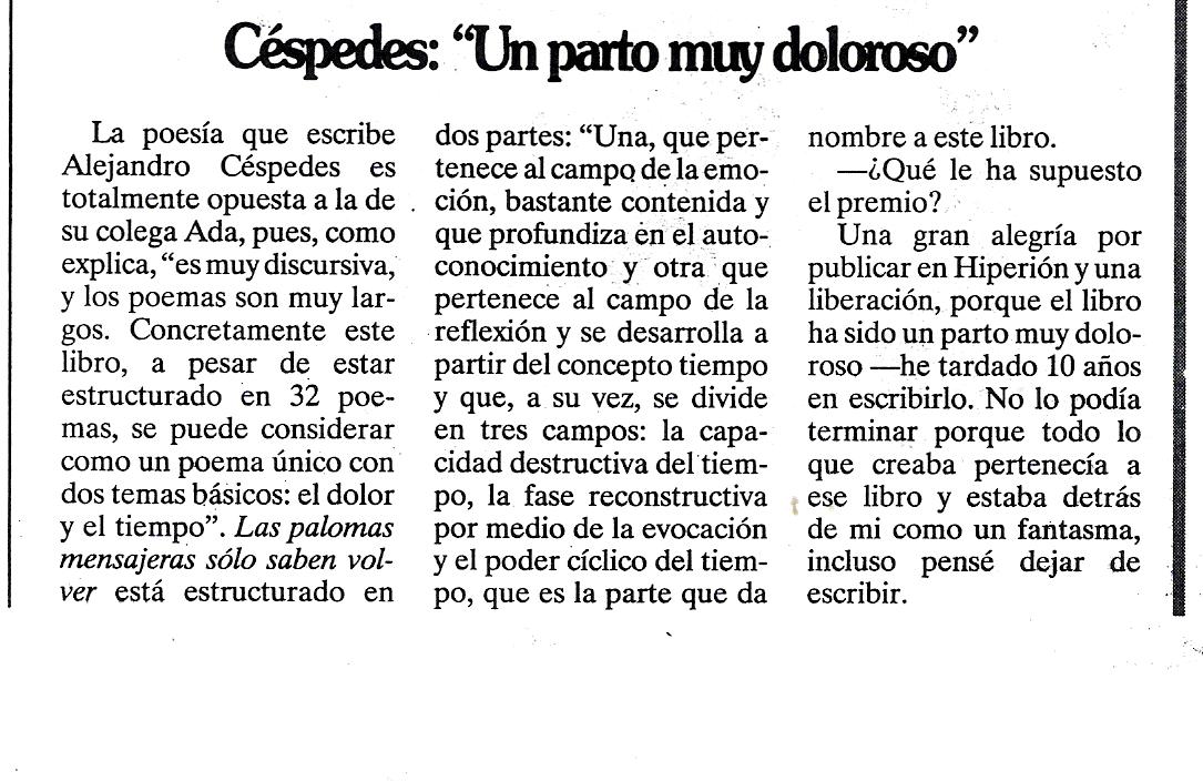«Me quedo con dos libros de poemas, "Las palomas mensajeras sólo saben volver", de Alejandro Céspedes (Hiperión), obra tan bella como su título en la que su autor, mostrando una notable evolución formal respecto a otros títulos suyos anteriores, poetiza sobre los territorios de la memoria, a los que Céspedes no puede evitar volver con nostalgia y dolor, y para acabar, con "Habitaciones separadas", de L. García Montero».