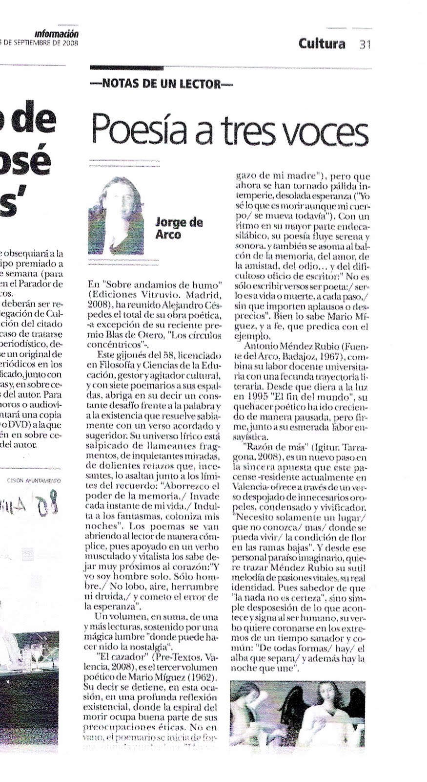 “Han pasado diez años de silencio editorial hasta encontrarnos con 'Sobre andamios de humo' que recoge toda su obra poética publicada hasta la fecha, permitiendo así al lector que no lo hubiera leído antes, apreciar la voz de uno de los poetas más hondos, lúcidos y fiel a sus convicciones de la actual poesía de nuestro país.